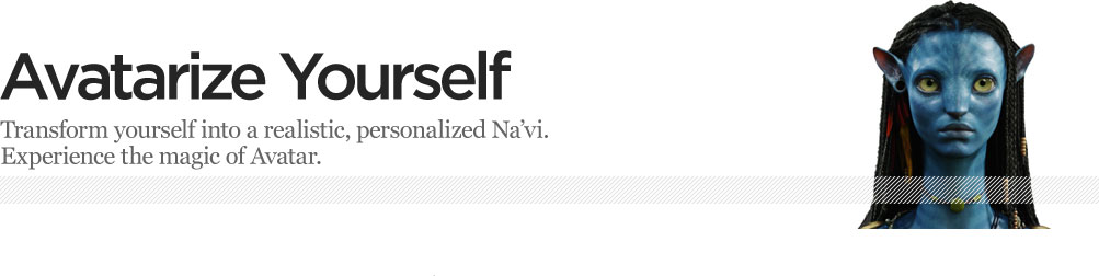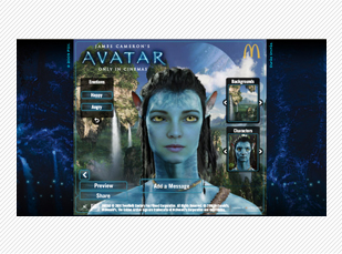 For McDonald's promotion of James Cameron's movie, Avatar, The Marketing Store and Oddcast teamed up to create Avatarize Yourself, a unique application allowing users to become part of the Avatar phenomenon. Utilizing cutting-edge 3d photo-morphing technology, "Avatarize Yourself" invited viewers to upload a head shot—or select one from Facebook—in order to instantly transform it into a believable rendition of a personalized Na'vi. Users could choose their gender and their background, and add a message.
