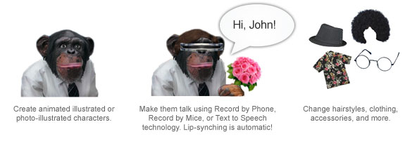 - Allow users to add speech to characters via a computer microphone, uploaded mp3 file, phone call or Text to Speech.